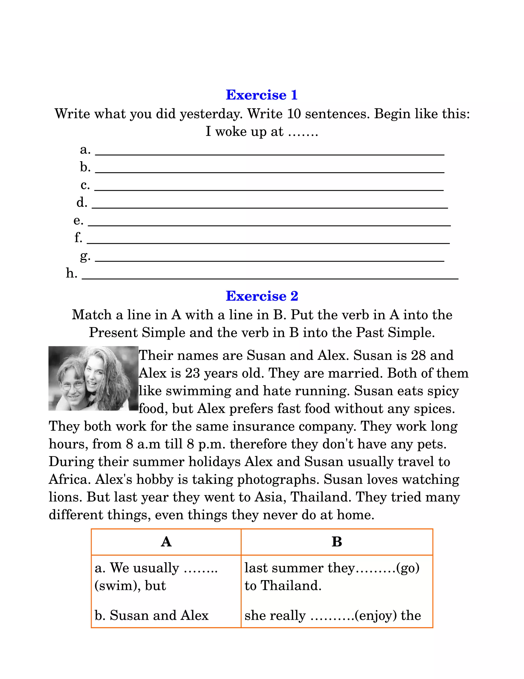 The document contains two writing exercises. The first asks the reader to write 10 sentences describing what they did the previous day beginning with "I woke up at...". The second exercise asks the reader to match lines from two tables where one verb is changed to the present simple and the other to the past simple. It also contains a third exercise that asks the reader to rearrange words into questions.