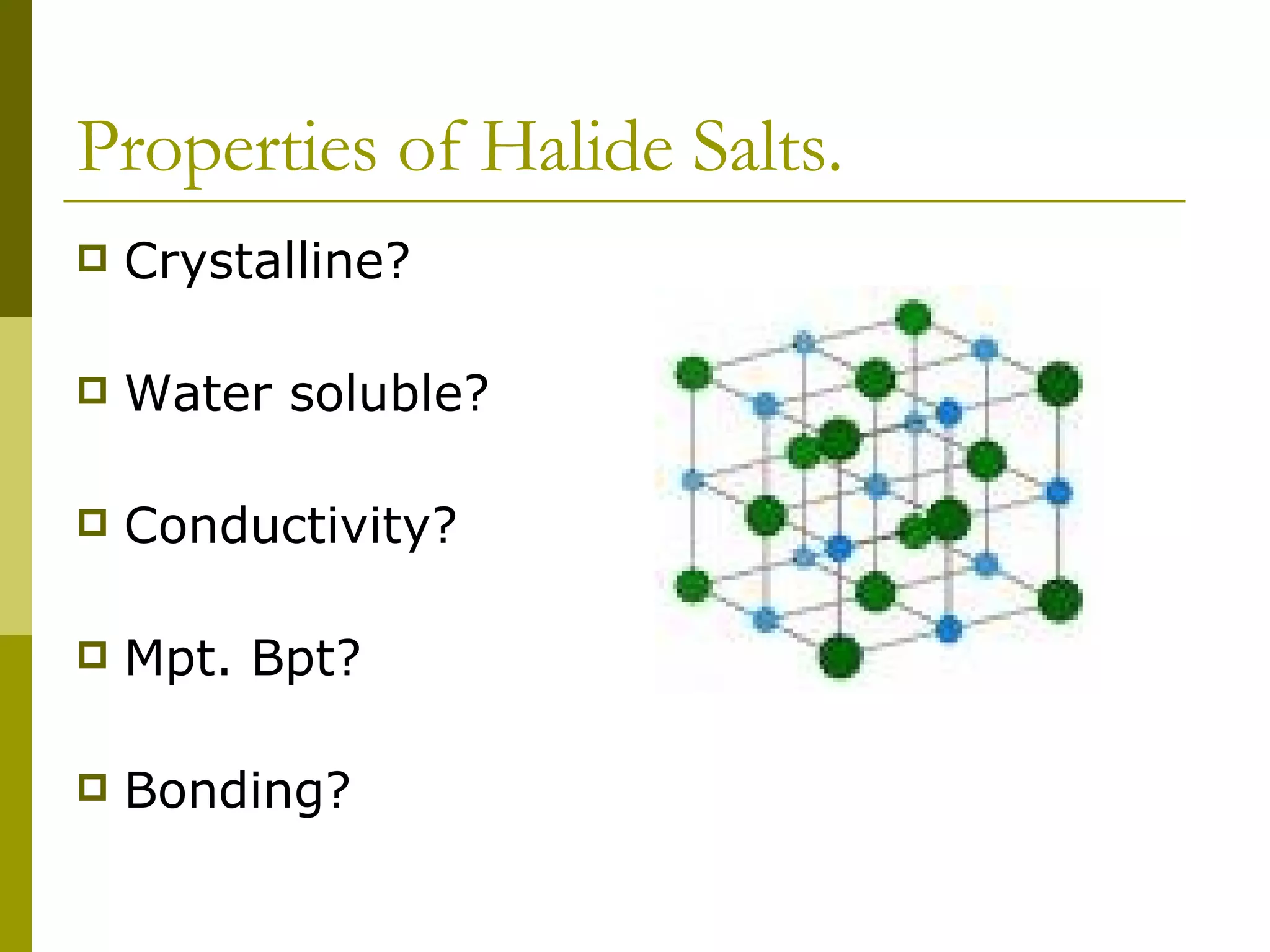 The document summarizes the properties and reactions of halide salts. Halide ions such as I- act as reducing agents in reactions. When halide salts react with concentrated sulfuric acid, hydrogen halides are produced which can further reduce the acid. Iodide is the strongest reducing agent of the halide ions due to its ability to reduce sulfuric acid to sulfur dioxide and hydrogen sulfide. Bromide and chloride are weaker reducing agents.