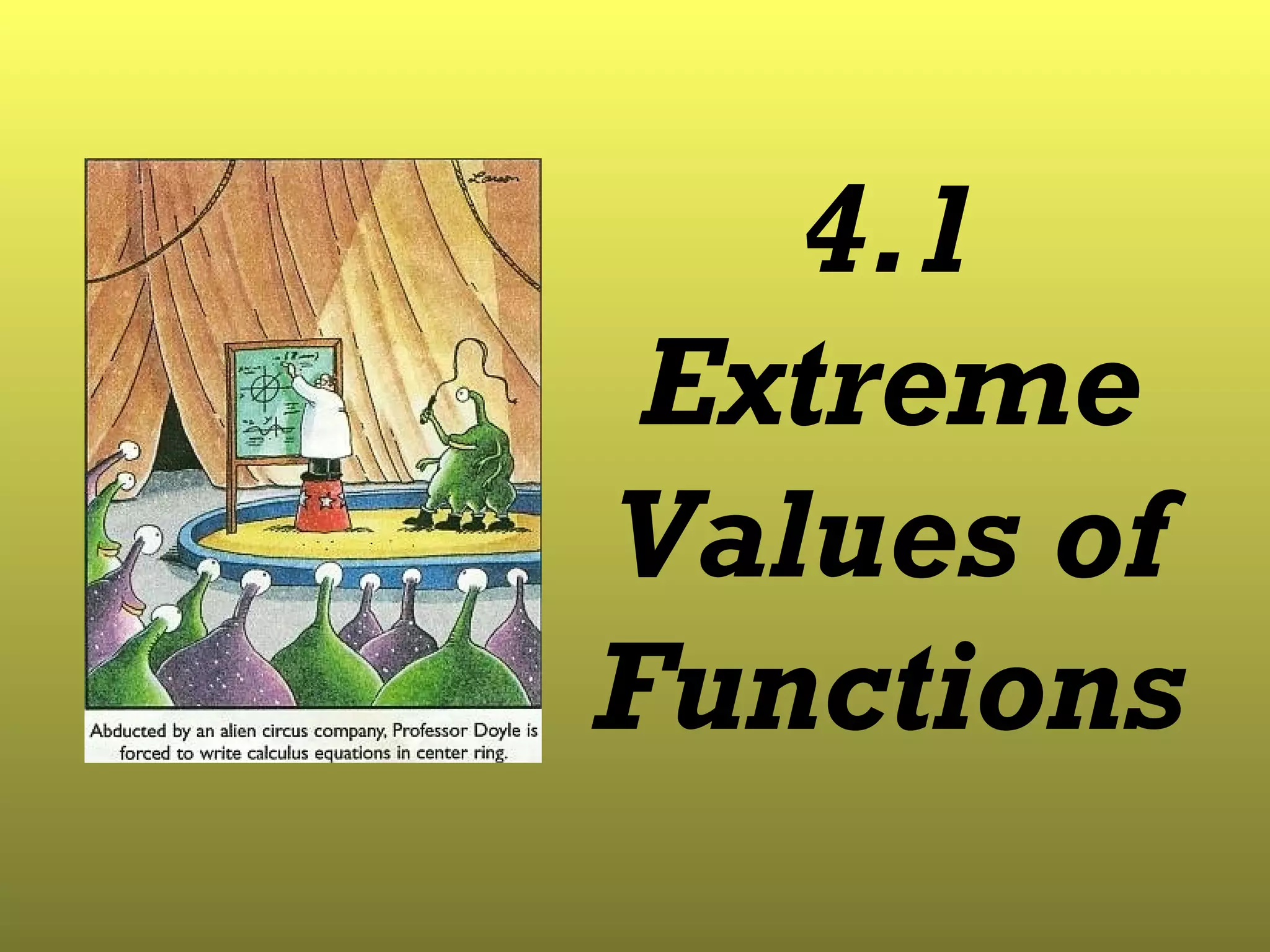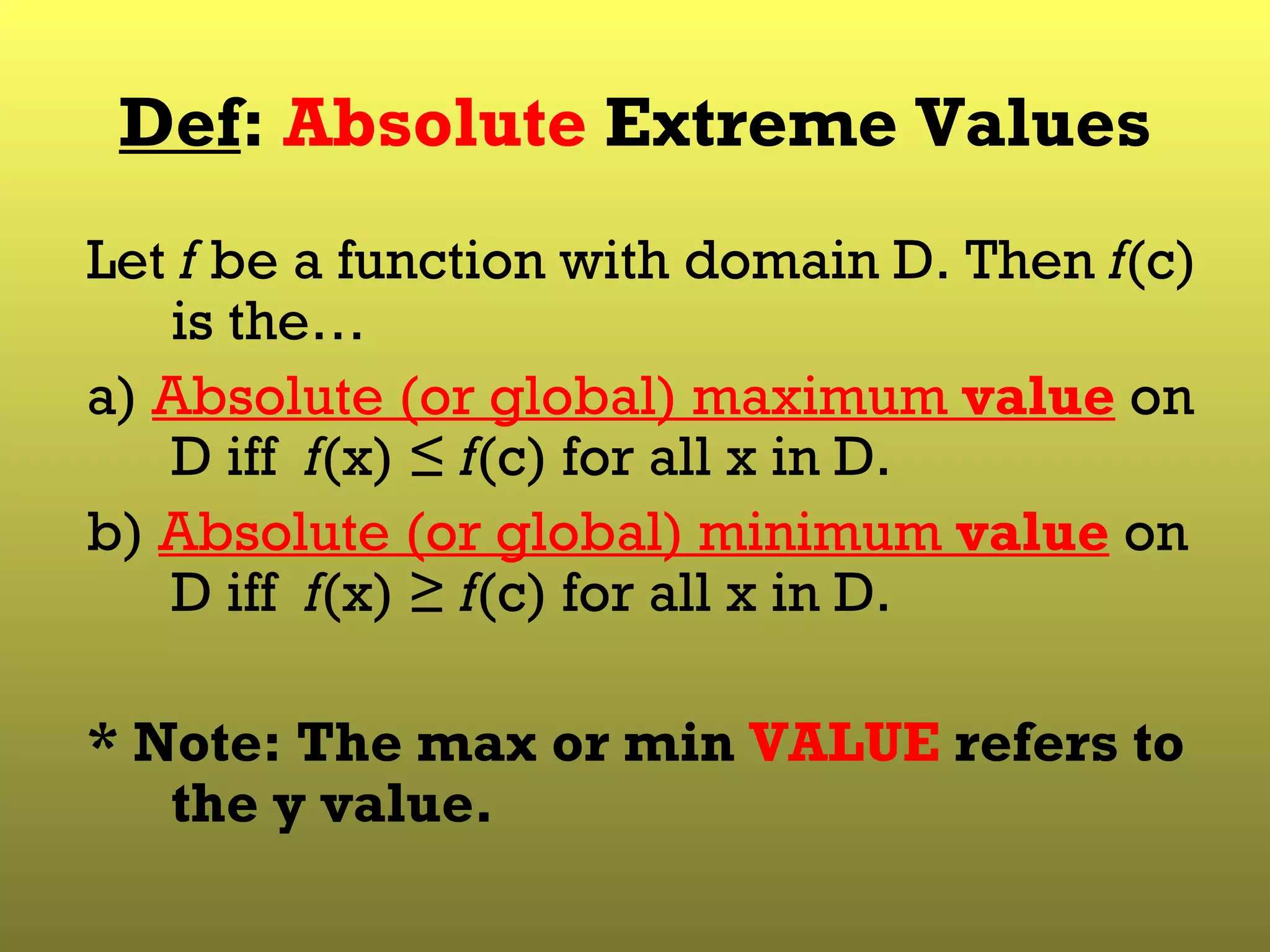 1) A function has an absolute maximum value on its domain if its value is greater than or equal to its value at all other points in its domain, and an absolute minimum value if its value is less than or equal to its value at all other points.