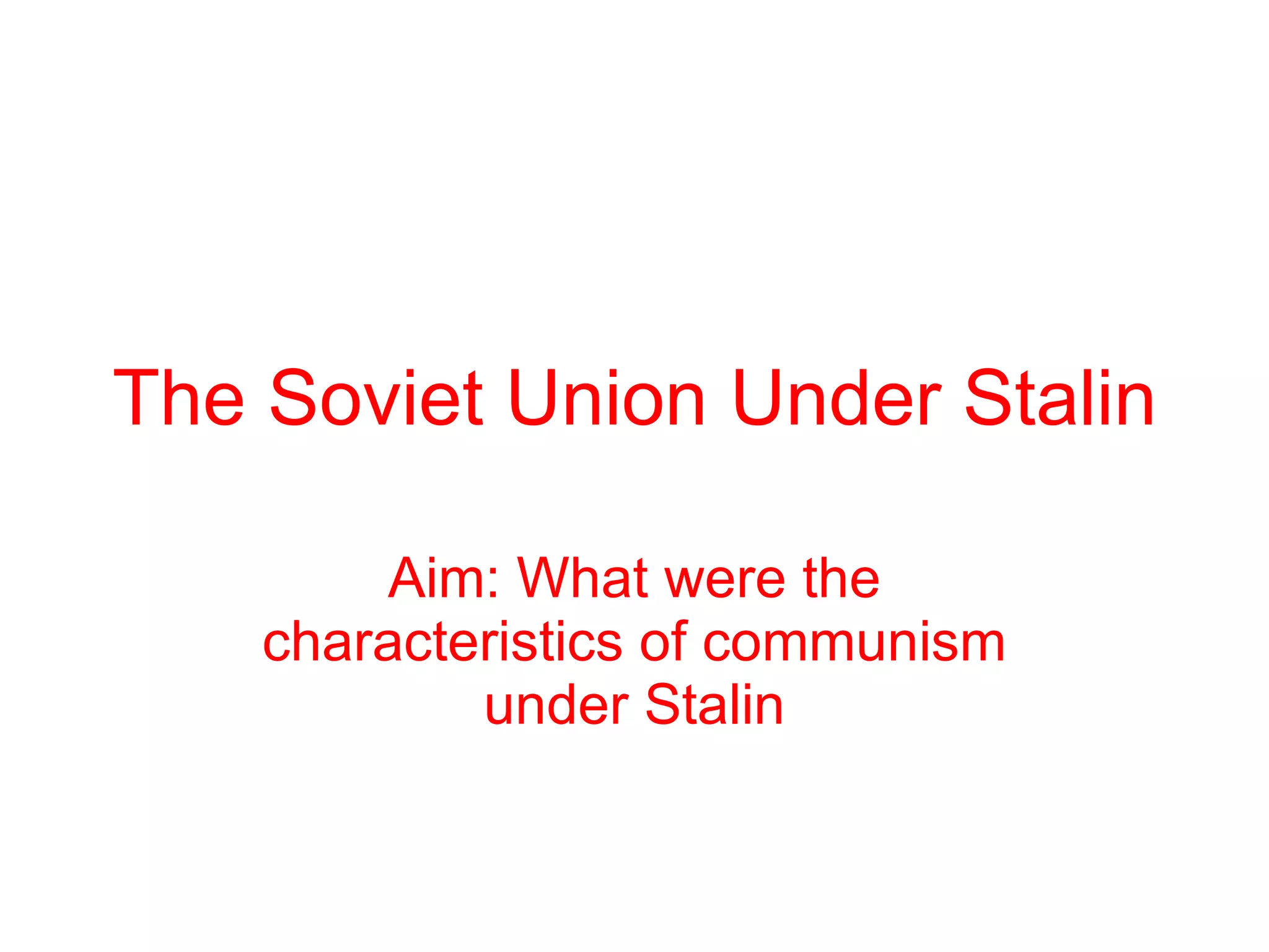 Under Stalin, the Soviet Union underwent forced agricultural collectivization which caused resistance from peasants. Stalin also launched the Great Purge starting in 1934 where he had the secret police target old Bolsheviks, army heroes, factory managers, writers, and regular citizens. Through torture and threats to families, people were forced to confess to crimes and around 4 million people were purged. Stalin consolidated his power through state propaganda, censorship, purges, and terror using the secret police. Atheism became official policy and the government seized church property and killed priests.
