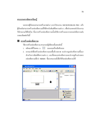 นอกจากผู้เรียนจะสามารถสร้างภาพต่าง ๆ จากโปรแกรม MICROWORLDS PRO แล้ว ผู้เรียนยังสามารถสร้างกล่องข้อความที่ใช้สาหรับพิมพ์ข้อความต่าง ๆ เพื่อนามาตกแต่งโปรแกรม ให้ส วยงามได้อีกด้วย ซึ่งการสร้างกล่องข้อ ความนั้นมีวิธีก ารสร้ างและการตกแต่งข้อความดัง รายละเอียดต่อไปนี้ การสร้างกล่องข้อความ วิธีการสร้างกล่องข้อความ สามารถปฏิบัติตามขั้นตอนดังนี้ 1. คลิกเมาส์ที่ไอคอน A บนแถบเครื่องมือด้านบน 2. ลากเมาส์เพื่อสร้างกล่ องข้อความบนพื้นที่วาดภาพ จะปรากฏกล่องข้ อความขึ้นมา สาหรับการพิมพ์ ข้อความต่าง ๆ และชื่อของกล่องข้อความจะปรากฏด้านล่างของ กล่องข้อความชื่อว่า TEXT1 ซึ่งเราสามารถตั้งชื่อให้กับกล่องข้อความได้