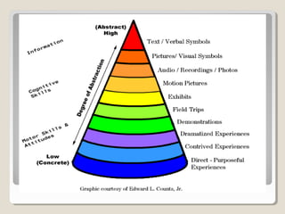 This document summarizes Edgar Dale's Cone of Experience, a model developed in 1946 to describe different types of learning experiences from most concrete to most abstract. The cone shows progression from direct experiences like seeing and touching at the bottom, to more abstract representations like symbols at the top. Dale intended the cone to describe different experiences, not judge their value. It summarizes his classification of 10 categories of mediated learning experiences. Later, commonly cited percentages about what people remember from different experiences were discredited and not part of Dale's original work.