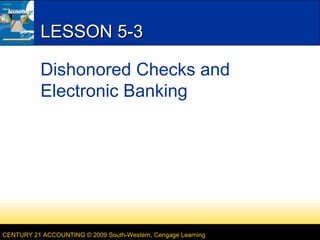 This document discusses how to record dishonored checks, electronic fund transfers, and debit card transactions in accounting. It provides steps for recording a dishonored check on a check stub, journalizing a dishonored check, journalizing an electronic funds transfer, and journalizing a debit card transaction. Key terms covered include dishonored check, electronic funds transfer, and debit card.