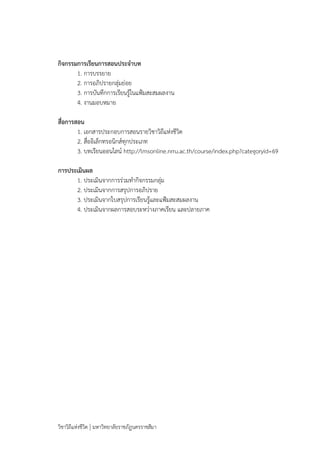 การอภิปรายกลุ่มย่อย 3. การบันทึกการเรียนรู้ในแฟ้มสะสมผลงาน 4. งานมอบหมาย สื่อการสอน 1. เอกสารประกอบการสอนรายวิชาวิถีแห่งชีวิต 2. สื่ออิเล็กทรอนิกส์ทุกประเภท 3. บทเรียนออนไลน์ http://lmsonline.nrru.ac.th/course/index.php?categoryid=69 การประเมินผล 1. ประเมินจากการร่วมทากิจกรรมกลุ่ม 2. ประเมินจากการสรุปการอภิปราย 3. ประเมินจากใบสรุปการเรียนรู้และแฟ้มสะสมผลงาน 4. ประเมินจากผลการสอบระหว่างภาคเรียน และปลายภาค