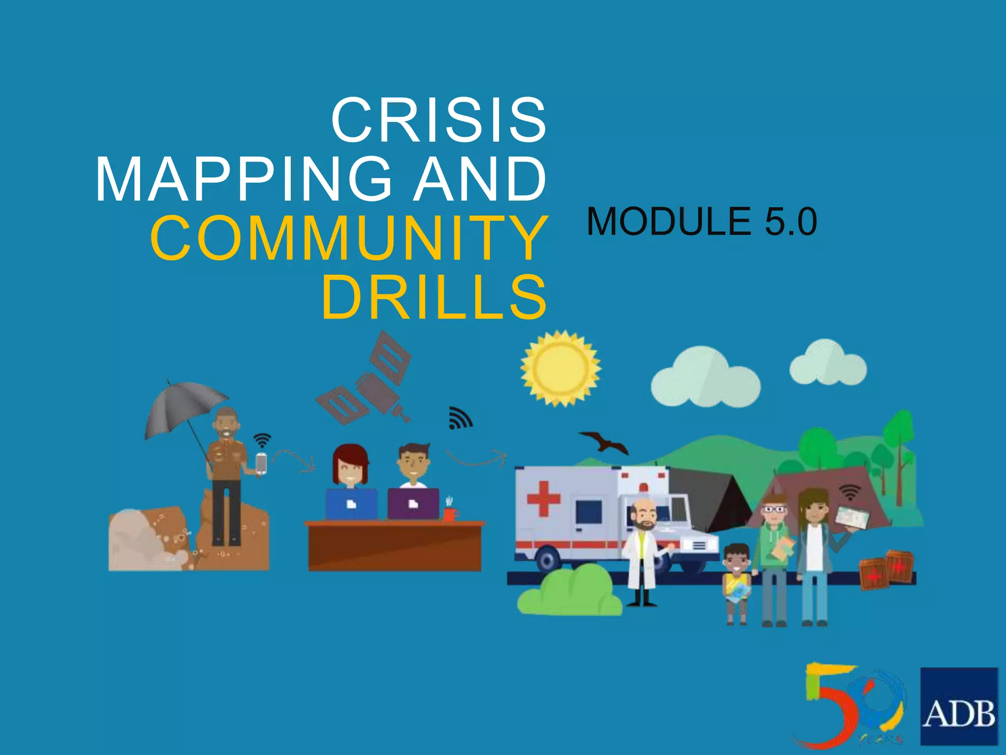 The document outlines the module on crisis mapping, emphasizing the real-time collection, display, and analysis of data during disasters to enhance disaster resilience and response. It details various types of reports—needs assessments, situational reports, and damage assessments—while highlighting the importance of community involvement and effective data collection methods. Additionally, community drills are discussed as a means to evaluate and improve disaster response capabilities, including the usage of mobile applications and communication protocols.
