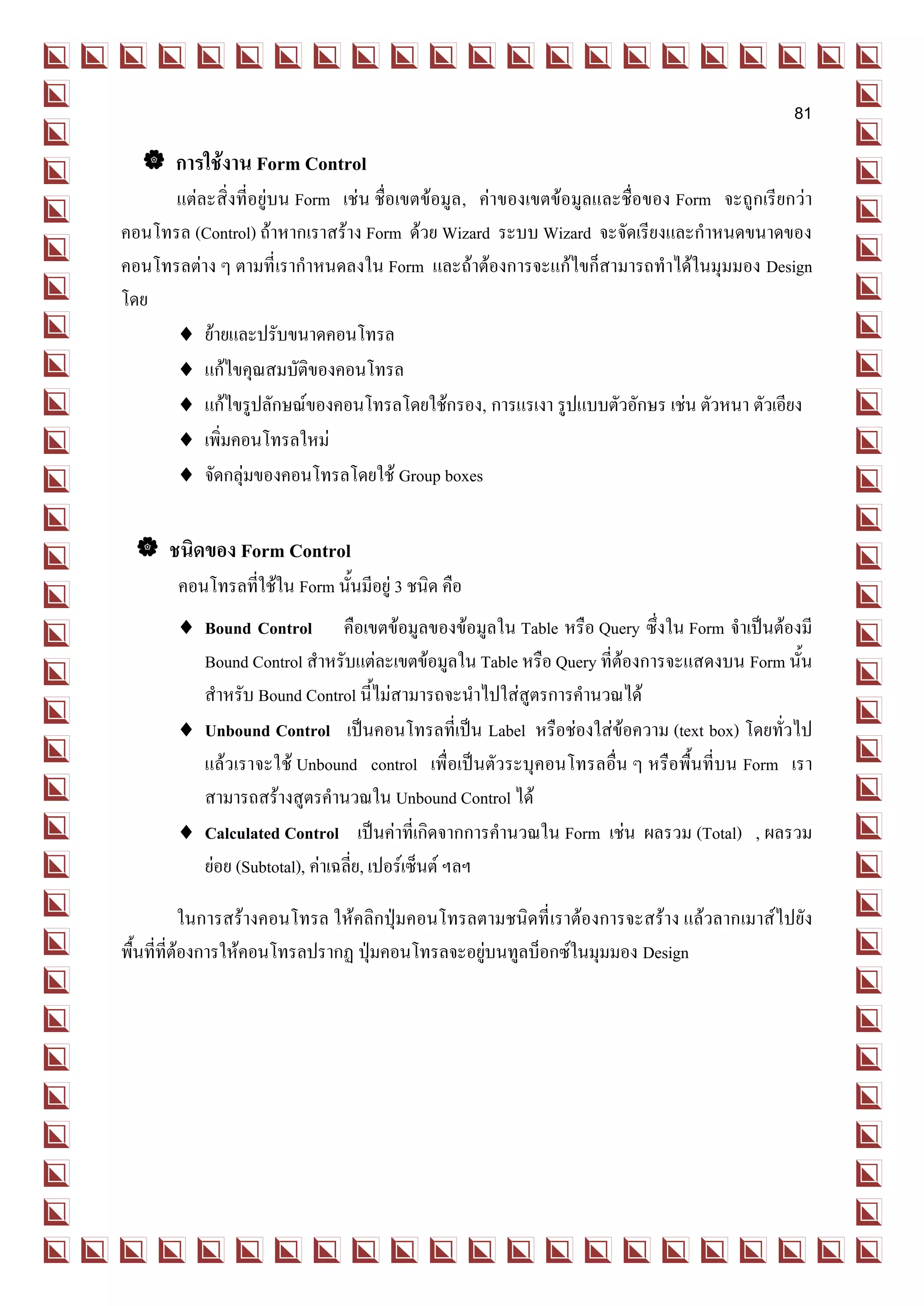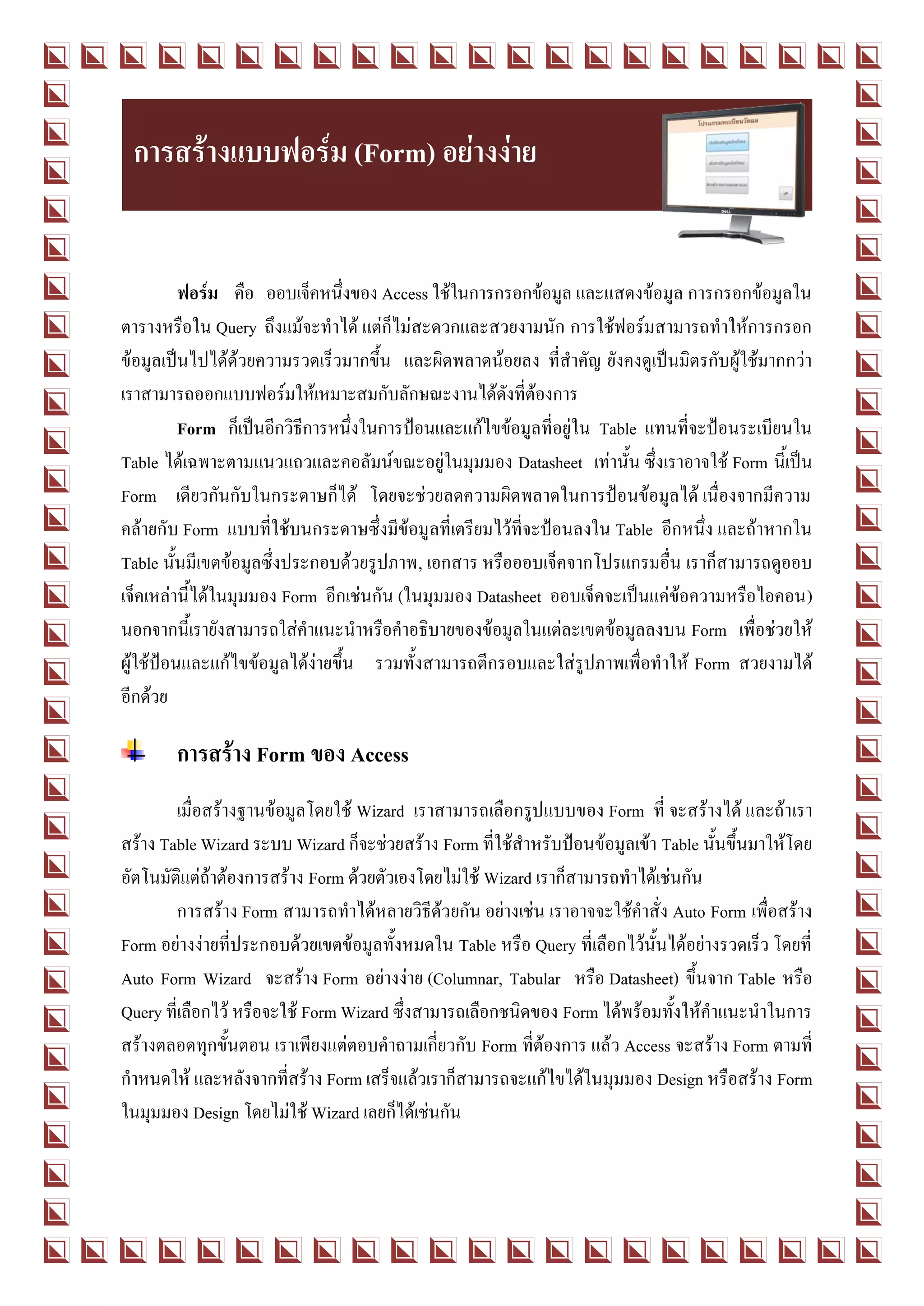 Form ในมุมมอง Design เสียก่อน โดยเรียกจากแท็บ Forms ในวินโดวส์ Database หรือจากมุมมอง Form