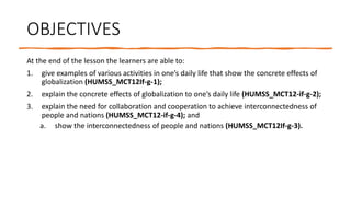This document provides an overview of globalization and its effects. It begins by defining globalization as the emergence of an international network belonging to an economic and social system. It then discusses several types of globalization including economic, social, political, financial, technological, ecological, and geographical. Specific examples are given for each type. The document emphasizes how globalization leads to interconnectedness between people and nations. It argues collaboration and cooperation are needed to achieve this interconnectedness. Daily life activities that involve cooperation and collaboration during the pandemic are given as examples showing the concrete effects of globalization.