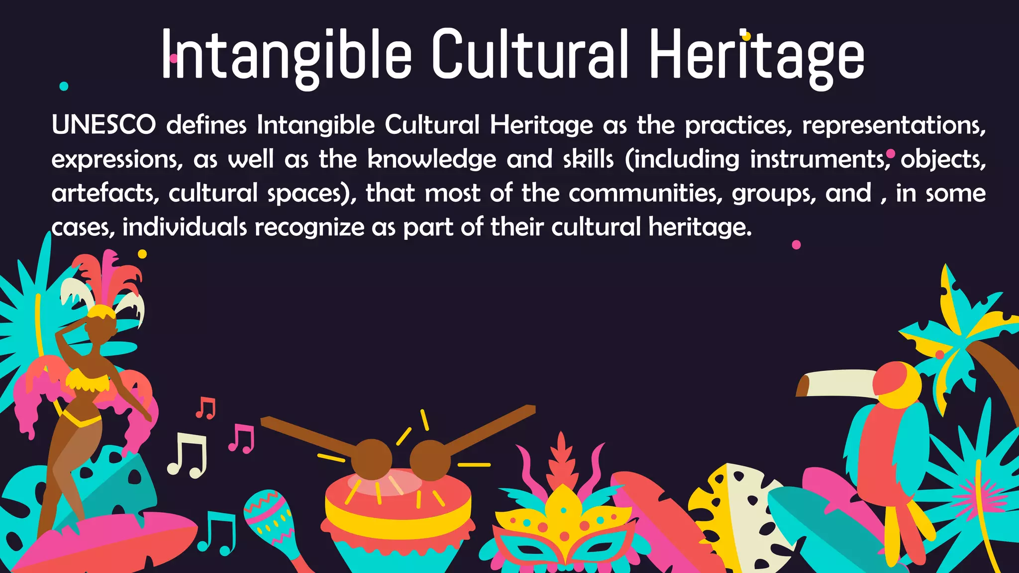 This document defines intangible cultural heritage and outlines its main characteristics and components. It discusses five main art forms of intangible cultural heritage: 1) oral traditions and expressions like myths, folktales, languages and chants; 2) performing arts such as music, dance and theater; 3) social practices, rituals and festive events that structure community life; 4) knowledge and practices concerning nature; and 5) traditional craftsmanship. Examples are provided for each category, such as folk dances, healing systems, and textile weaving. Mappers are told to document intangible heritage with videos, photos, and other materials.