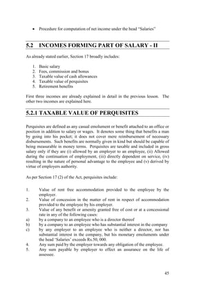 The document provides details about income under the salary head in India, specifically focusing on perquisites and retirement benefits. It defines perquisites as benefits provided in addition to salary. Perquisites are further classified into categories - those taxable for all employees, those taxable only for specified employees, and those fully exempt. Various perquisites like rent-free housing, transport, medical benefits, and education are described in detail including tax treatment and valuation methods. Retirement benefits and the process for computing taxable salary income are also outlined.