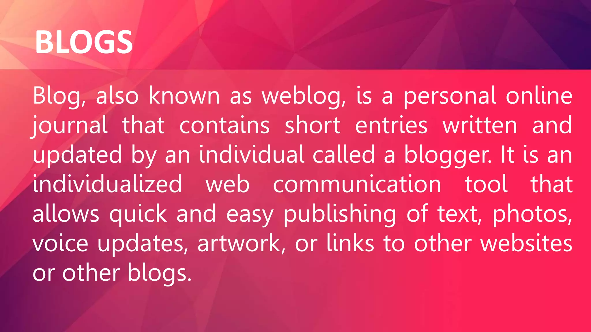 This document discusses blogging and provides guidance on posting materials safely and responsibly. It defines a blog as an online journal where an individual called a blogger writes and updates short entries. There are different types of blogs including personal, business, school, private, and how-to blogs. Starting a blog is important as it allows people to share thoughts, stay connected, promote creativity, and help businesses build relationships with customers. The document outlines the steps to create a blog post and publish it, and provides dos and don'ts for blogging such as asking permission before posting other's content and writing respectfully.