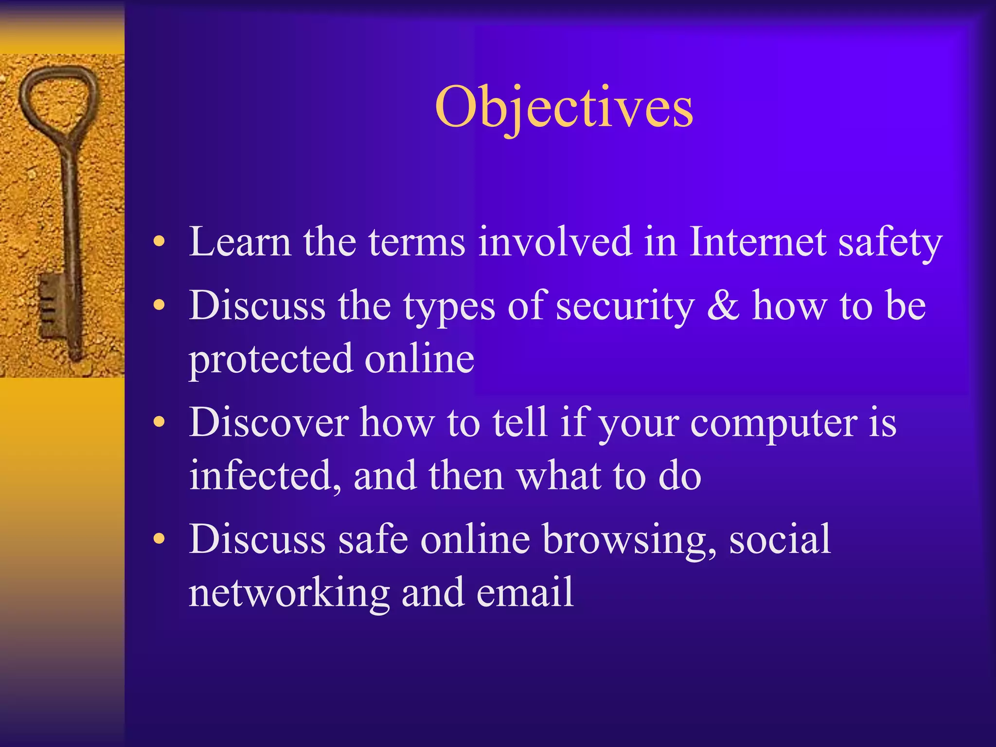 This document provides information on how to stay safe online. It defines common internet threats like viruses, malware, spam and phishing. It recommends using antivirus software, firewalls, and strong passwords for security. The document signs of an infected computer and explains what to do if infected. It also provides tips for safe email, social media and web browsing practices like limiting personal information shared online and caution with links and downloads. Overall it aims to educate users on internet security terminology and best practices.