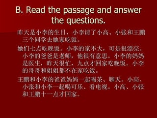 Little Li invited her classmates Little Gao, Little Zhang, and Wang Peng to her house for her birthday dinner. They ate at 7pm. Little Li's home is not large but very beautiful. Little Li's father is a teacher and is an interesting person. Little Li's mother is a doctor and was busy so she came home late at 9pm. Little Li's brother and sister were not home for the dinner. Wang Peng drank tea and chatted with Little Li's parents. Little Gao, Little Zhang and Little Li drank cola and watched TV. Little Gao, Little Zhang and Wang Peng left Little Li's home at 11pm.