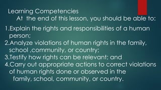 This lesson emphasizes the importance of understanding human rights and corresponding responsibilities, highlighting that rights are inherent to all individuals and must be protected by the state. It explains that with each right comes a responsibility, such as studying if one has the right to education or voting wisely when participating in community development. Ultimately, the lesson conveys that recognizing and properly exercising one's rights is essential for personal empowerment and societal justice.