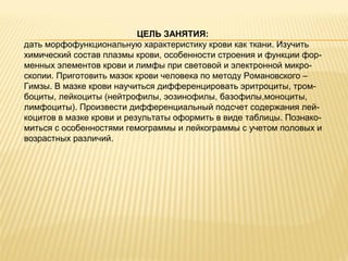 Документ описывает цель занятия, связанную с морфофункциональной характеристикой крови и лимфы, включая изучение их химического состава и компонентов. Учащиеся будут готовить мазок крови и изучать форменные элементы, а также проводить дифференциальный подсчет лейкоцитов. Контрольные вопросы касаются различных аспектов крови, включая классификацию форменных элементов и их функции.
