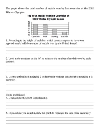 This document contains a worksheet about misleading graphs. It includes graphs that use different scales, making the data appear different than it is. Students are asked questions to identify how the graphs are misleading and how they could be improved. Specifically, one graph shows medal counts from the 2002 Winter Olympics in a way that makes it seem Norway won half as many as the US, when in fact the US won more. The scales start above zero and are unevenly spaced.