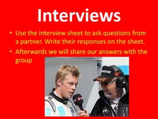 (1) Interviews using the simple past tense, "Wh" questions, adjectives to describe cities and weather, comparing places, describing one's hometown, and having conversations about weather and temperatures.