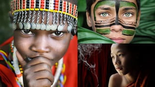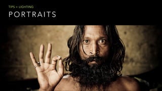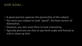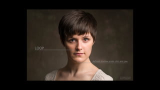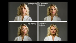 This document provides tips for taking better portrait photographs. It discusses using a large aperture to blur the background and focusing on the subject. While most portraits are taken at eye level, changing the angle can provide a creative perspective. Playing with eye contact, such as having the subject look off-camera or at something in the frame, can make portraits more candid and interesting. The document also covers lighting portraits using soft, diffused front lighting and experimenting with lighting directions and multiple light sources. It describes lighting patterns such as split lighting, loop lighting, Rembrandt lighting, and butterfly lighting.