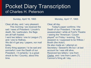 This document is a transcription of diary entries from Charles H. Peterson from April 16-17, 1865. On April 16, Peterson receives news of President Lincoln's death but has no details. Everything seems sad and sorrowful over the death of the President. On April 17, the newspaper confirms Lincoln was assassinated at Ford's Theatre while watching a play. The assassin is believed to be actor John Wilkes Booth, who also attempted to kill Secretary of State Seward but he survived at last report. Flags continue to be flown at half-mast over the death of the President.