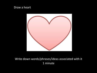 The document discusses the concepts of denotation and connotation as they relate to the word "heart." It explains that the denotation of heart is a muscle, pump, blood, organ, and body, while the connotations include love, feelings, romance, and sweet. The document also explores how mise-en-scene, which means "putting into the scene," analyzes the setting, costumes, actors, lighting, and positioning of objects and people in media to understand how meaning is constructed.