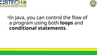 This document explains how to control the flow of a Java program using loops and conditional statements. It details the various types of loops (while, do-while, for, and enhanced for) and their specific use cases, as well as compares them with conditional statements like if and switch. Understanding when to use each construct is crucial for writing efficient Java programs.