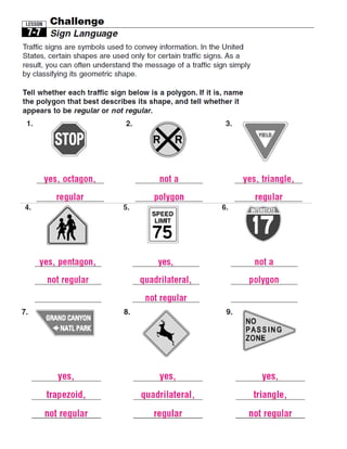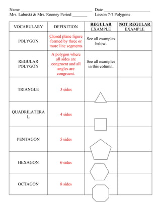 This document provides definitions and examples of polygons, including regular and irregular polygons. It defines a polygon as a closed plane figure formed by three or more line segments. A regular polygon is one where all sides are congruent and all angles are congruent, while examples of irregular polygons do not meet these criteria. Specific polygons are defined by the number of sides, including triangles with 3 sides, quadrilaterals with 4 sides, pentagons with 5 sides, hexagons with 6 sides, and octagons with 8 sides.