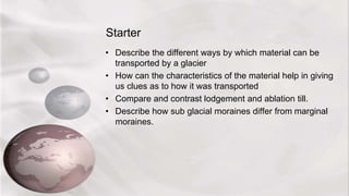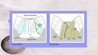 - Glacial deposits include till, drumlins, moraines, eskers, and outwash plains formed from fluvio-glacial sediments. Landforms provide clues about glacial transport processes and ice flow direction.