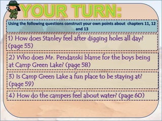 This document provides reading comprehension questions and prompts for students to summarize chapters from the book "Holes" by Louis Sachar. It asks students to write a paragraph summarizing the previous day's reading, and then provides questions to help students construct points about chapters 11-13. The document continues by prompting students to read the next chapters and make their own points about Stanley's feelings and any exciting events. Finally, it provides additional questions for students to use to construct points about chapters 14-16.