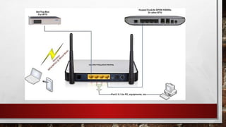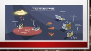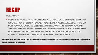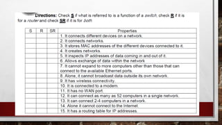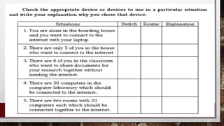The document discusses two scenarios involving resource sharing for a video log project, addressing how to connect laptops using a crossover LAN cable and implementing a switch for multiple devices. It provides an overview of routers, their configurations, and the differences between switches and routers, along with detailed steps for configuring a wireless router. Additionally, it includes a set of questions and assessments related to networking concepts, emphasizing the importance of security and configuration in networking.