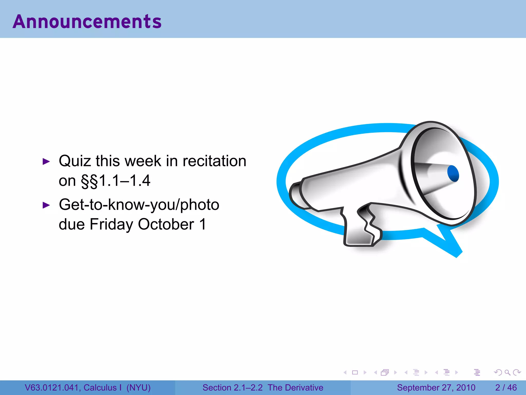 The document outlines topics to be covered in Calculus I class sessions on the derivative and rates of change, including: defining the derivative at a point and using it to find the slope of the tangent line to a curve at that point; examples of derivatives modeling rates of change; and how to find the derivative function and second derivative of a given function. It provides learning objectives, an outline of topics, and an example problem worked out graphically and numerically to illustrate finding the slope of the tangent line.