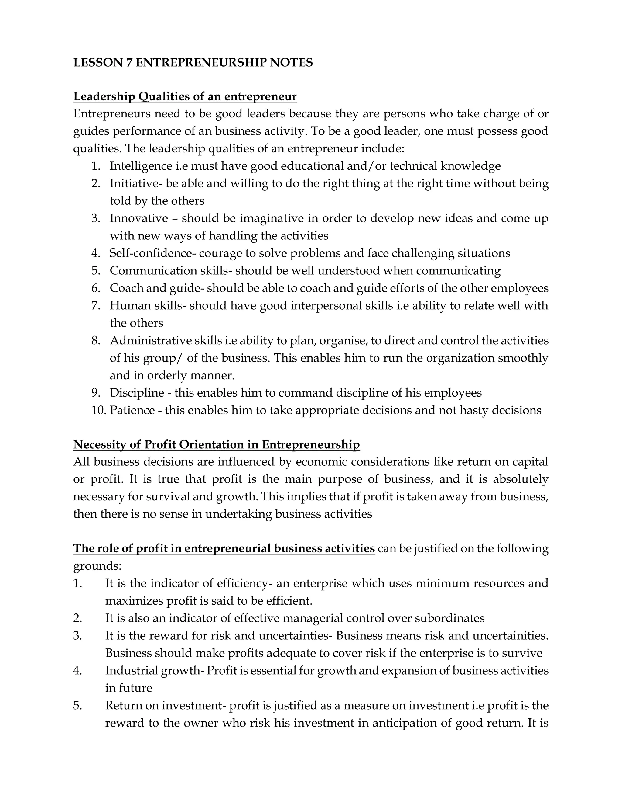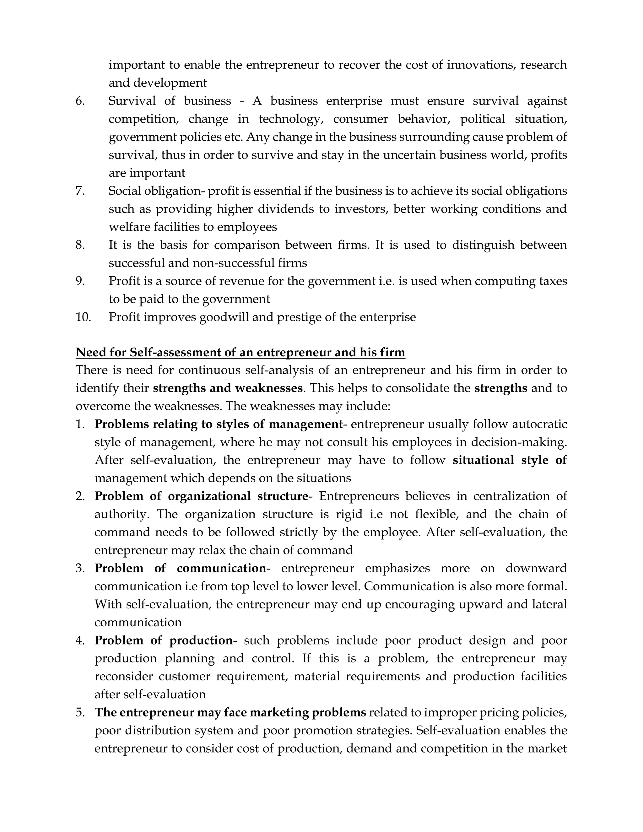Entrepreneurs need strong leadership skills to guide a business. Key qualities include intelligence, initiative, innovation, self-confidence, communication skills, and the ability to coach employees. Profit is essential for a business to survive and grow by rewarding risk, enabling reinvestment, and allowing businesses to fulfill social obligations. Entrepreneurs should regularly self-assess their management style, organization structure, communication, production, marketing, personnel policies, finances, and relationships with external stakeholders to strengthen their business and overcome weaknesses. There are many sectors where entrepreneurs can start businesses, such as pharmaceuticals, insurance, tourism, banking, transportation, communication, education, food, garments, agriculture, and brokerage.