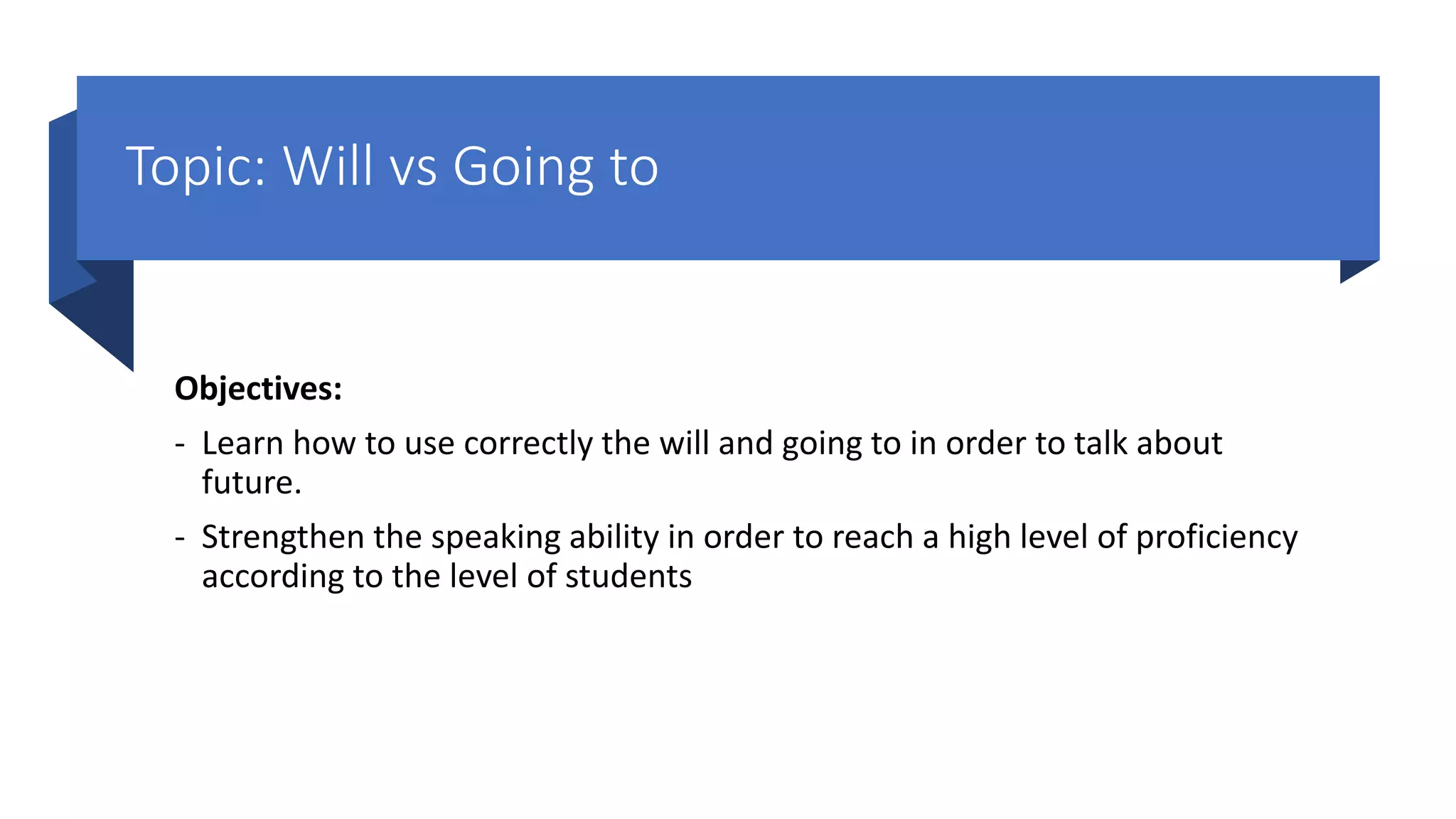 The document provides a lesson plan on using will versus be going to for talking about the future, including objectives to learn how to correctly use will and be going to and strengthen speaking ability. It includes warm-up questions about dreams for the future, examples sentences with will and be going to, and links to practice exercises and a sample conversation using will and be going to.