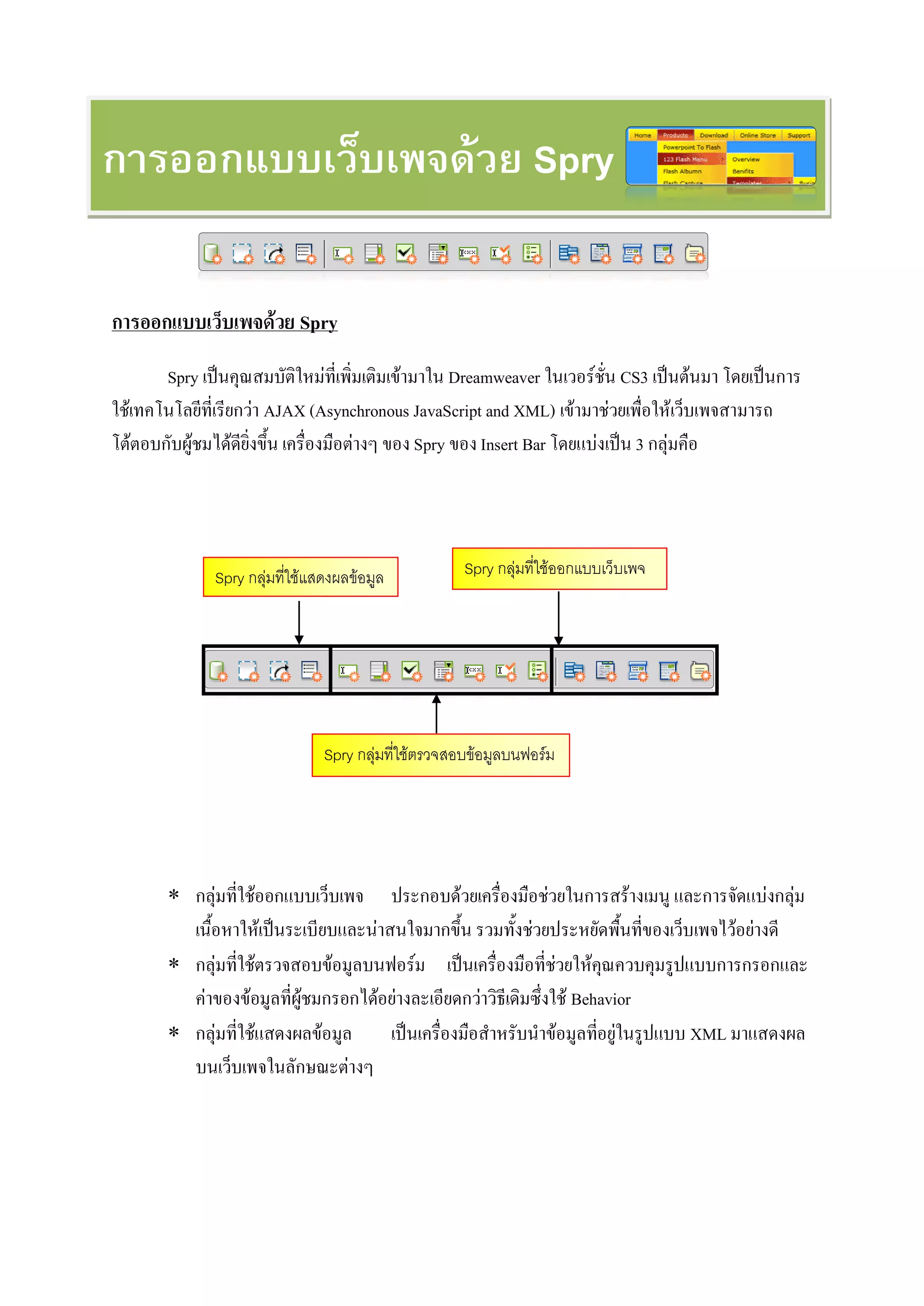 Dreamweaver ในเวอร์ชั่น CS3 เป็นต้นมา โดยเป็นการ ใช้เทคโนโลยีที่เรียกว่า AJAX (Asynchronous JavaScript and XML) เข้ามาช่วยเพื่อให้เว็บเพจสามารถ โต้ตอบกับผู้ชมได้ดียิ่งขึ้น เครื่องมือต่างๆ ของ Spry ของInsert Bar โดยแบ่งเป็น 3 กลุ่มคือ กลุ่มที่ใช้ออกแบบเว็บเพจ ประกอบด้วยเครื่องมือช่วยในการสร้างเมนู และการจัดแบ่งกลุ่ม เนื้อหาให้เป็นระเบียบและน่าสนใจมากขึ้น รวมทั้งช่วยประหยัดพื้นที่ของเว็บเพจไว้อย่างดี กลุ่มที่ใช้ตรวจสอบข้อมูลบนฟอร์ม เป็นเครื่องมือที่ช่วยให้คุณควบคุมรูปแบบการกรอกและ ค่าของข้อมูลที่ผู้ชมกรอกได้อย่างละเอียดกว่าวิธีเดิมซึ่งใช้ Behavior กลุ่มที่ใช้แสดงผลข้อมูล เป็นเครื่องมือสาหรับนาข้อมูลที่อยู่ในรูปแบบ XML มาแสดงผล บนเว็บเพจในลักษณะต่างๆ Spry กลุ่มที่ใช้แสดงผลข้อมูล Spry กลุ่มที่ใช้ออกแบบเว็บเพจ Spry กลุ่มที่ใช้ตรวจสอบข้อมูลบนฟอร์ม การออกแบบเว็บเพจด้วย Spry