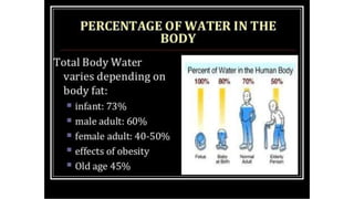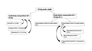The document discusses the composition and functions of various human body fluids. It begins by explaining that water makes up 60% of the adult male body mass, with fat and protein each making up around 20% and 15% respectively. The document then discusses the intracellular and extracellular fluid compartments, with intracellular fluid making up 70% of total body water and extracellular fluid making up the remaining 30%. Key body fluids such as plasma, interstitial fluid, transcellular fluid, cerebrospinal fluid, amniotic fluid, and urine are described. Common functions of body fluids include transporting oxygen, nutrients, and waste; regulating temperature; and aiding metabolism.