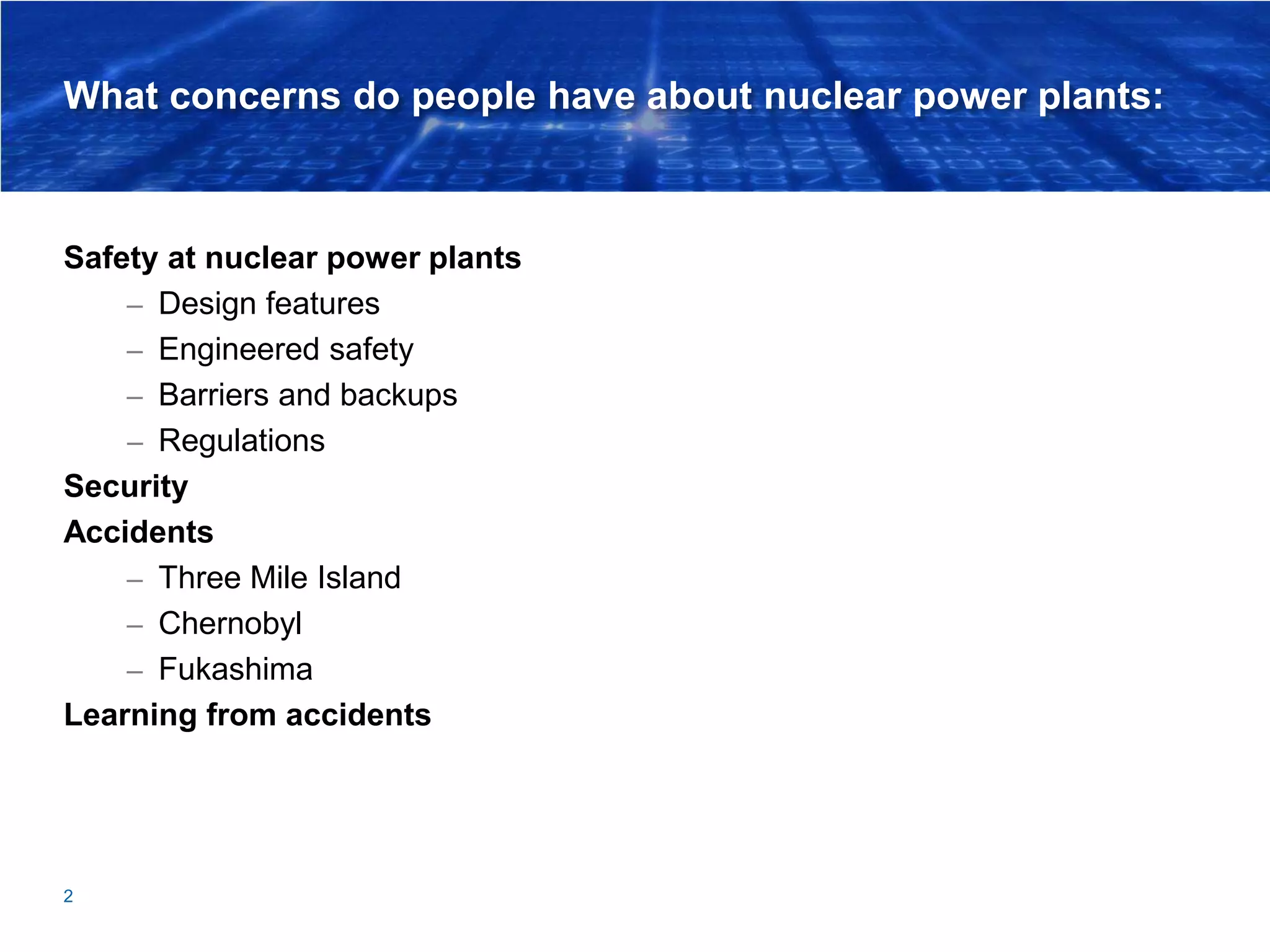 The document discusses the main concerns people have about nuclear power plants, which include safety, security, and accidents. It explains that nuclear power plants are designed with multiple safety systems and barriers to contain radiation and protect workers and the public, and that safety is the top priority in decisions around designing, building, licensing, and operating nuclear plants. Accidents that have occurred at some nuclear plants are also examined to identify ways to further improve safety.