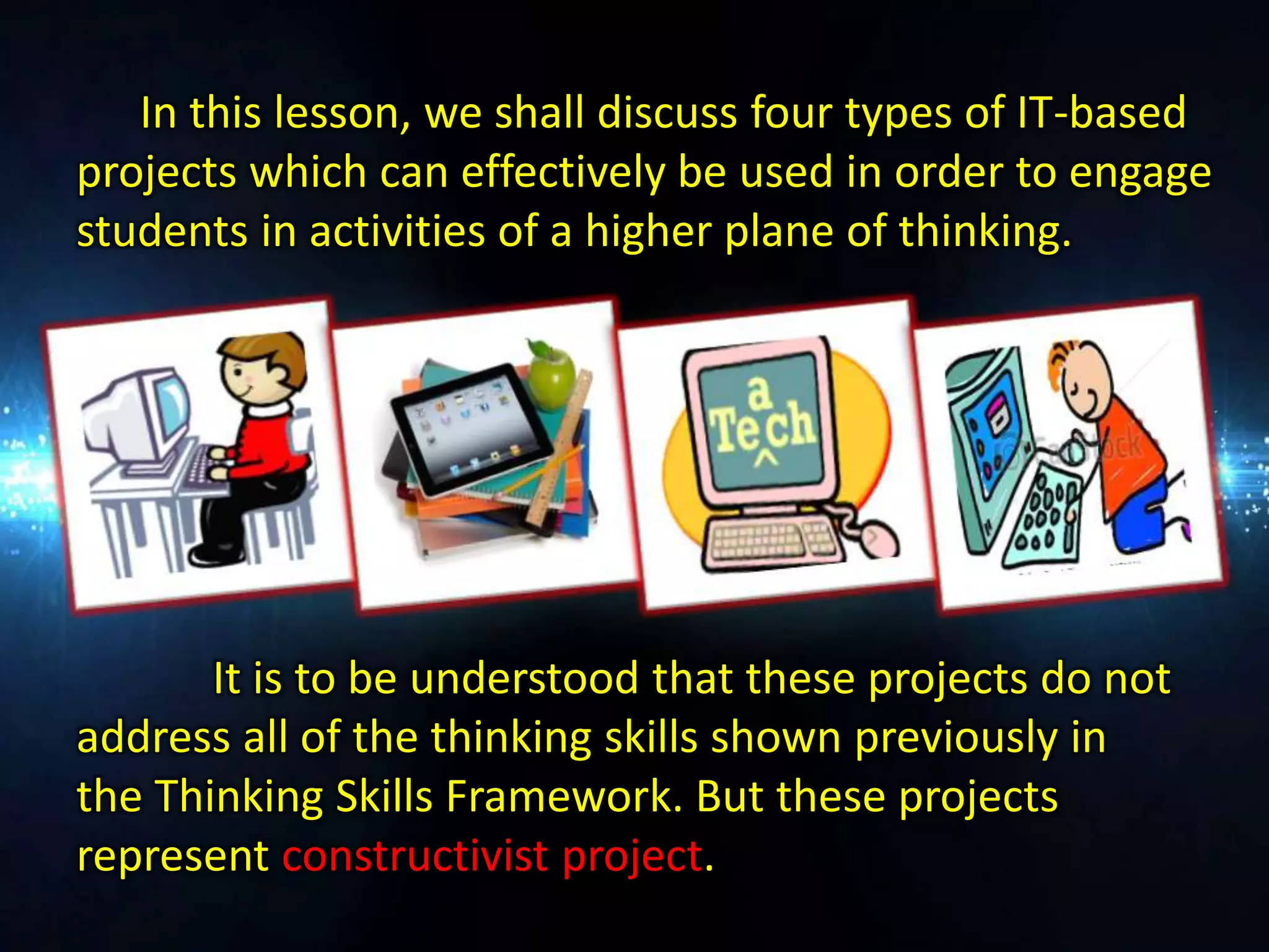 This document discusses four types of IT-based projects that can engage students in higher-order thinking: resource-based projects, simple creations, guided hypermedia projects, and web-based projects. Resource-based projects involve students finding their own information to address topics or problems provided by the teacher. Simple creations focus on developing creativity through brainstorming, judging ideas, and acting on ideas with flexibility. Guided hypermedia projects involve using multimedia tools like PowerPoint or creating multimedia presentations combining different media. Web-based projects involve students creating and posting web pages on given topics.
