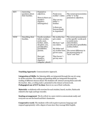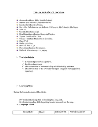 The document summarizes an English lesson taught by Natalia Klein at Cem 24 school in Rio Colorado, Argentina. The 80-minute lesson focused on family members and used the song "The Family Song" as the main material. Students practiced possessive adjectives, pronouns, and the verb "have got." Activities included listening to the song, filling in blanks, matching lines, and ordering stanzas. Students worked in pairs and as a group. For homework, they were assigned to bring a photo of their family to the next class.