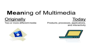 Multimedia is content that uses a combination of different media types such as text, audio, images, animations, video and interactive content. It can be recorded, played, displayed or interacted with using electronic devices. Multimedia is distinguished from traditional media by including audio and video. It has advantages for learning like increased effectiveness, gaining attention, and reducing training costs.