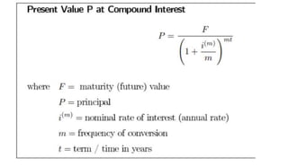 This document provides information about simple and compound interest calculations. It defines key terms like principal, interest rate, and time period. It explains the formulas for calculating simple interest and compound interest, both annually and for other time periods like quarterly or monthly. Sample problems are provided for calculating interest, principal, and future values in simple and compound interest scenarios.