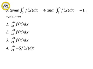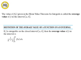 The document defines definite integrals and discusses their properties. It states that a definite integral evaluates to a single number by integrating a function over a closed interval from a lower limit to an upper limit. It gives examples of using definite integrals to find areas bounded by curves. The mean value theorem for integrals is also introduced, which states that there is a rectangle between the inscribed and circumscribed rectangles with an area equal to the region under the curve. Exercises are provided on evaluating definite integrals and applying the mean value theorem.