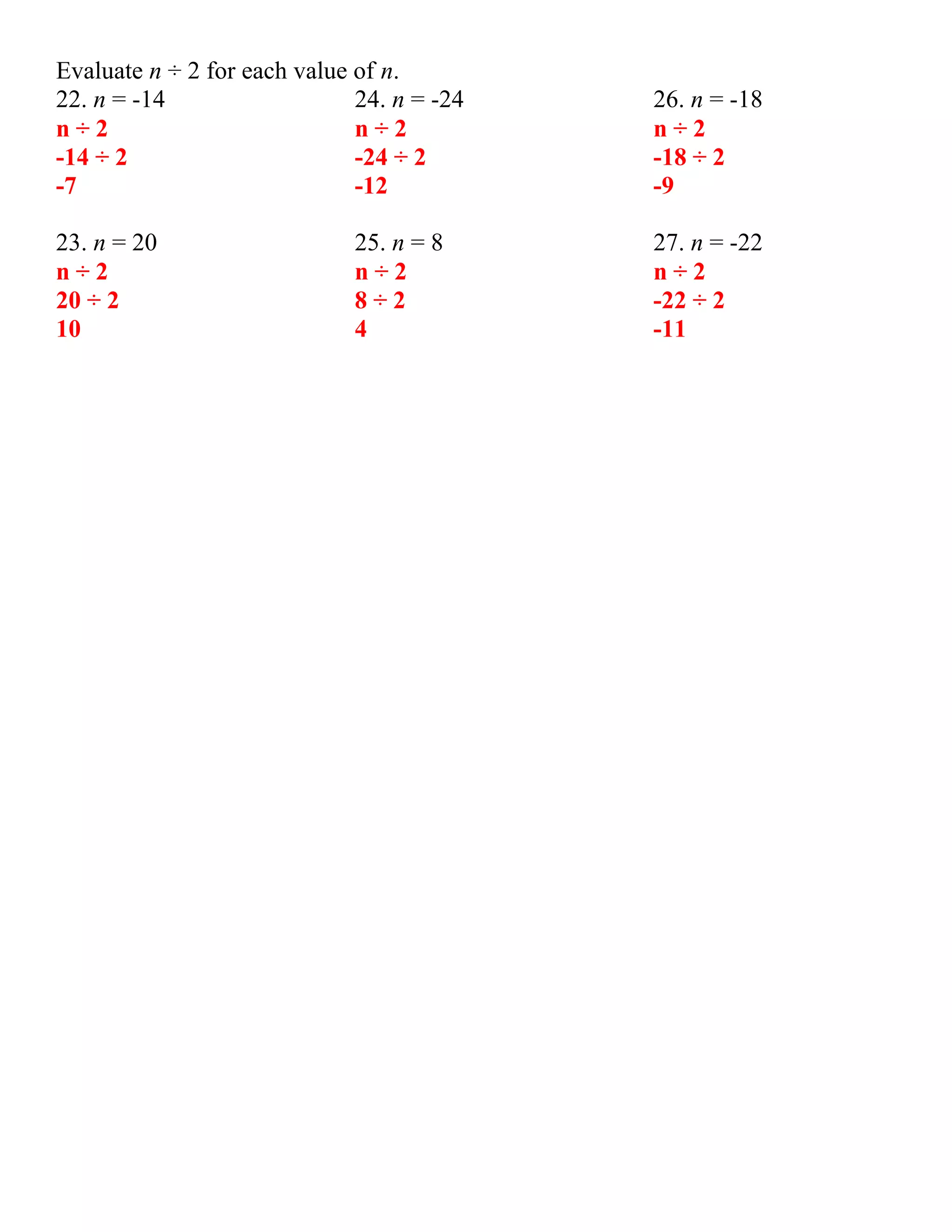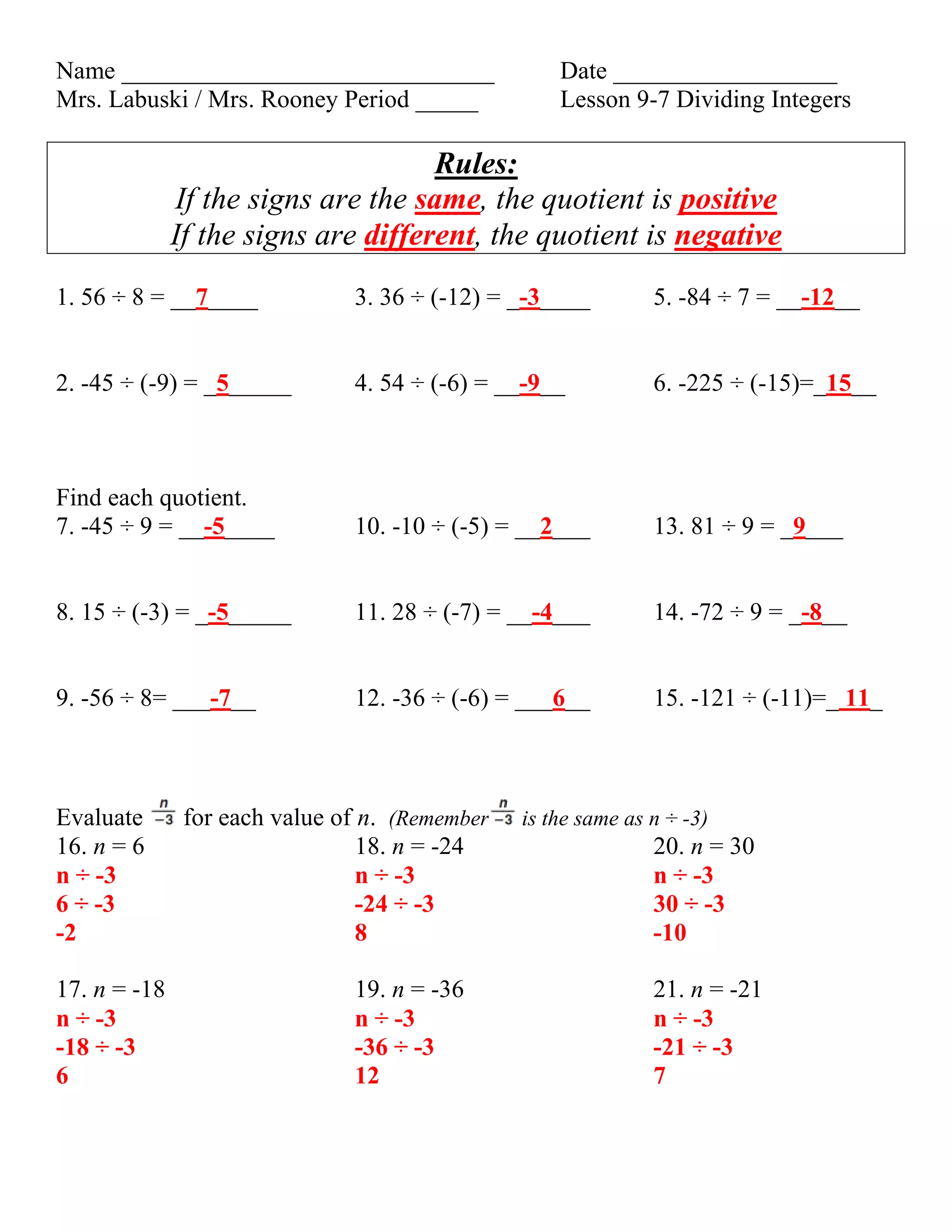The document contains a math lesson on dividing integers. It reviews the rules that if the signs of the numbers being divided are the same, the quotient is positive, and if the signs are different, the quotient is negative. It then has students evaluate 27 division problems involving integers of various signs. The problems cover dividing integers where both numbers are positive, both are negative, and one is positive and one is negative. It also has students evaluate expressions of n divided by constants for different values of n.