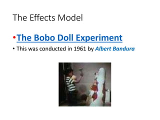 This document discusses representation of ethnicity in media through various theories and concepts. It begins by explaining the effects model and hypodermic needle theory, which view audiences as passive receivers of media messages. It then provides examples of dominant, subordinate, and hegemonic groups. The rest of the document discusses common stereotypes of different ethnic groups in media and why challenging stereotypes is important. It also notes more positive representations are possible and outlines Alvarado's four themes of dangerous, humorous, pitied, and exotic representations.