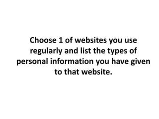 This document discusses data protection and accessibility regarding interactive media. It provides learning objectives about explaining accessibility laws and researching the Data Protection Act. It asks the learner to choose a website they use regularly and list the personal information provided to it. Several concerns about companies holding personal data are outlined, such as unauthorized access, inaccurate information, and storing data without permission. Laws related to accessibility like the Disability Discrimination Act and Equality Act are mentioned. The document instructs learners to include terms about interactive media in their report and address the learning objectives.