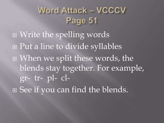 This document provides instructions for students to practice spelling words, identify syllables and blends, and use graphic organizers. It also introduces vocabulary words for students to discuss with a partner. The final section provides background information and photos of Leonardo da Vinci's unfinished sculpture, Horse, for students to look at to learn about the steps taken to build the statue.