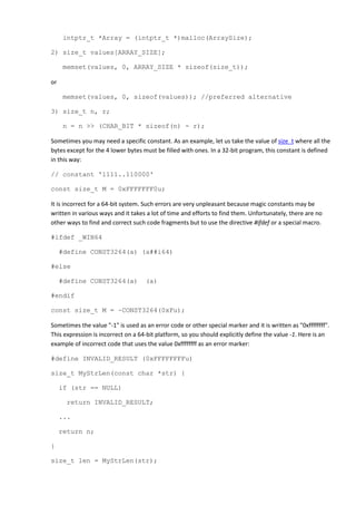 The document discusses the dangers of using magic numeric constants in code when porting from 32-bit to 64-bit systems, highlighting how these constants can lead to inefficiencies and errors. It provides examples of incorrect code practices and suggests the use of safe constants and expressions to prevent issues. The document also mentions the use of diagnostic tools to identify such magic constants and underscores the importance of cautious coding practices in 64-bit application development.