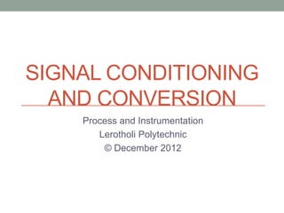 The document outlines the signal conditioning process, including amplification, attenuation, filtering, and conversion, with a focus on operational amplifiers (op-amps). It explains the properties and various configurations of op-amps, such as inverting, summing, differential, and buffer amplifiers. Each configuration has specific applications and characteristics, emphasizing their importance in signal processing and instrumentation.