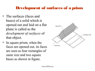 This document discusses the development of surfaces for prisms and cylinders. It defines surface development as opening out the faces and bases of an object onto a flat plane. For prisms and cylinders, the parallel line method is used, involving drawing parallel lines the length of the base perimeter and marking faces between them. It provides examples of developing various prisms and cylinders, describing the steps like drawing projections, marking new points, and completing the development. Tips are given like using a 2H pencil first and projecting points accurately. References for further reading are also included.