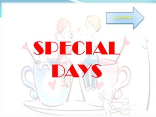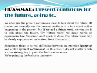 The document discusses the present continuous tense and how it can be used to talk about future plans. It notes that the present continuous is used when a plan has been made before speaking, and provides examples comparing using the present continuous versus "going to" when referring to future intentions or plans. The document also lists some common activities associated with various special days and holidays.