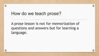 This document outlines the steps for teaching prose: