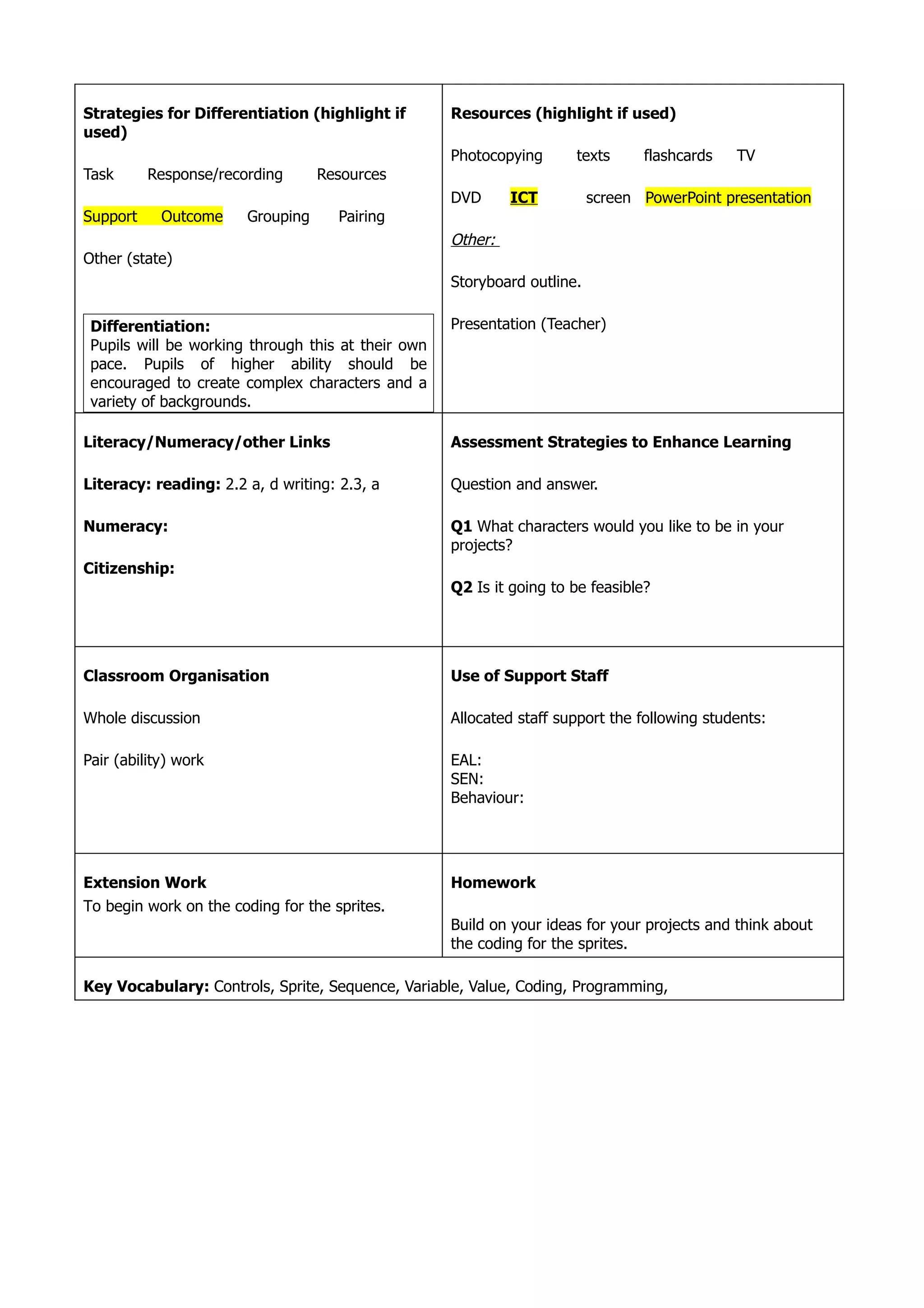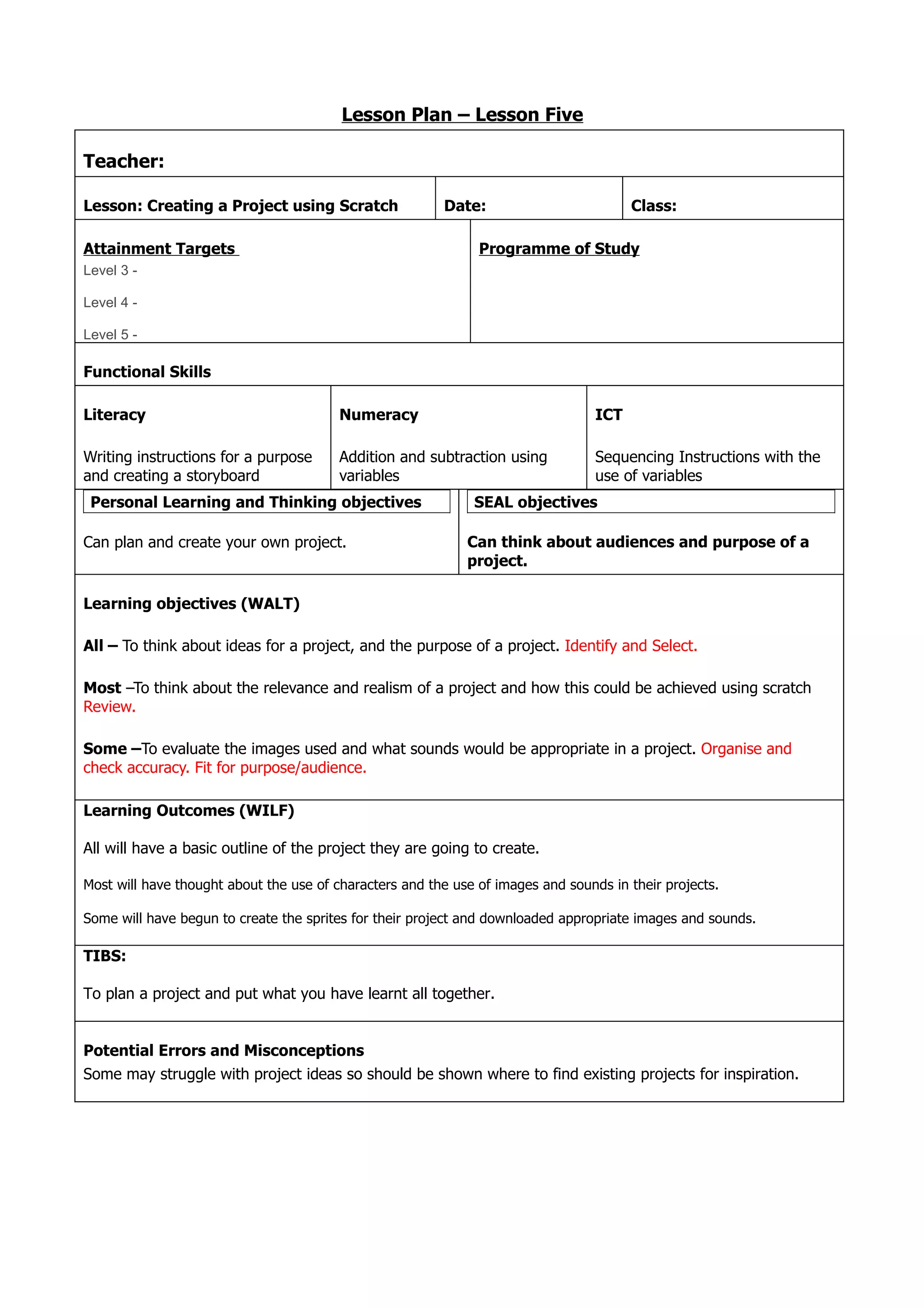 This lesson plan outlines a lesson on creating a project using Scratch. The objectives are for students to plan their own project by thinking of ideas and purposes, and to begin creating sprites and backgrounds. Students will work through a storyboard planning process and PowerPoint tutorial. Higher ability students should create more complex characters and varied backgrounds. Assessment will involve questions about project plans and characters. Students will begin coding sprites for their projects.