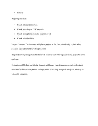This lesson plan outlines an activity where students will learn about writing and recording podcasts. Students will first listen to an excerpt from FDR's inauguration speech. They will then write scripts for their own podcasts on a school issue they want to change. Using classroom computers and microphones, students will record their podcasts and post them to the school website. Finally, students will listen to each other's podcasts and provide feedback on whether the recordings were good or needed improvement.